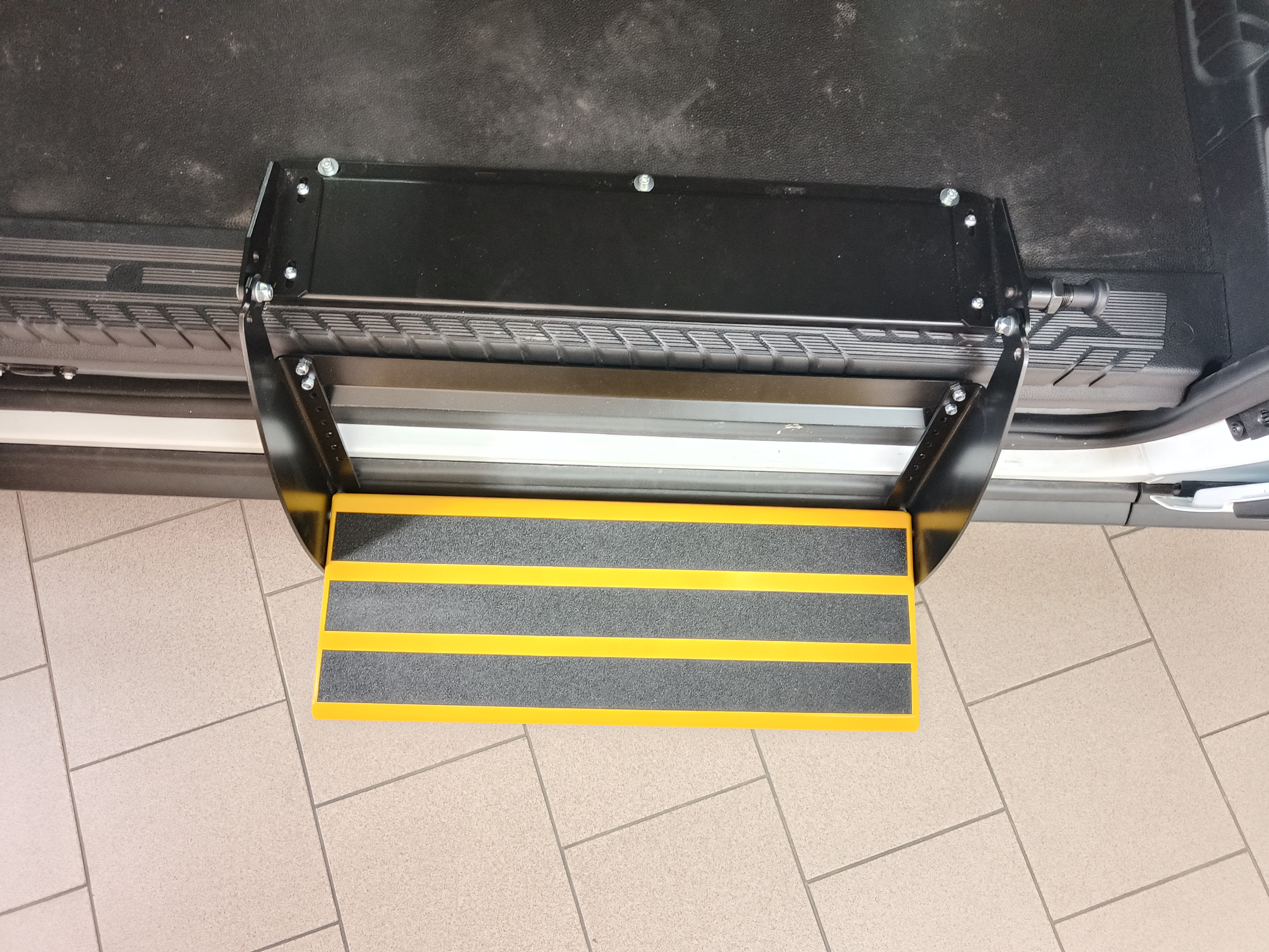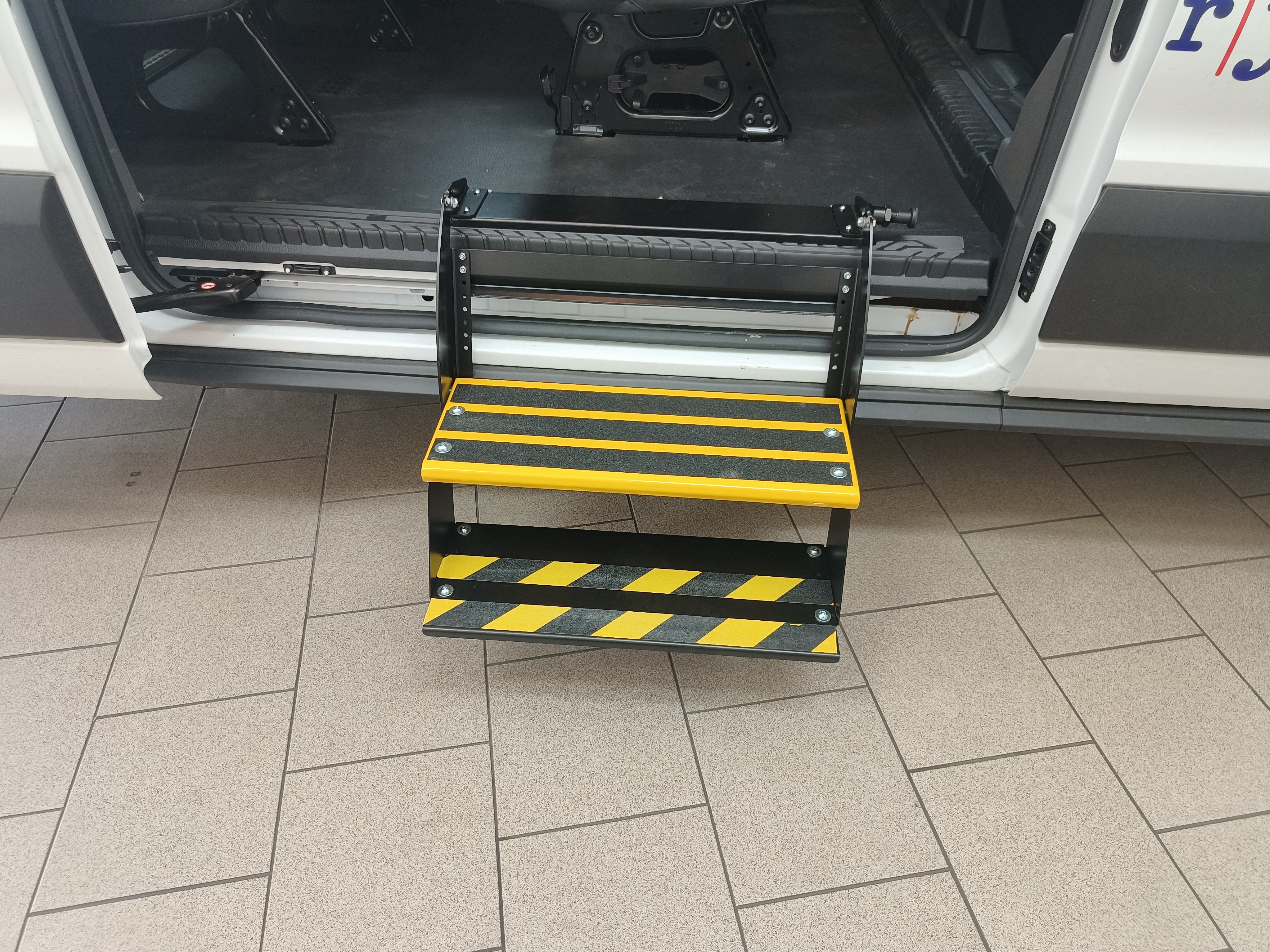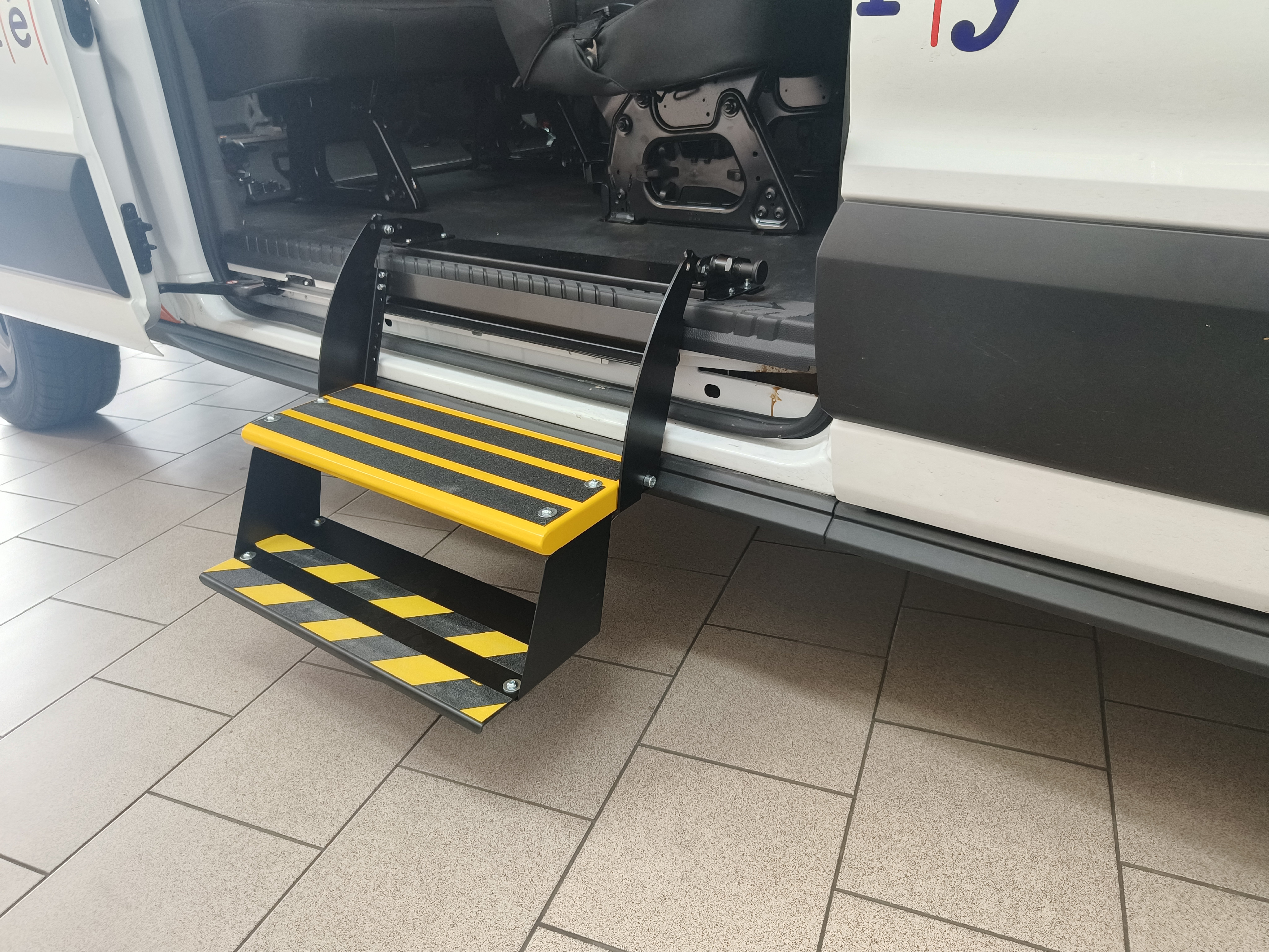 Дополнительная ступенька используется, прежде всего, в автомобилях-фургонах для более легкой посадки и высадки пассажиров второго или же третьего рядов сидений. Ступеньки мы можем изготовить складные индивидуально для конкретного автомобиля. Можно использовать и ступеньки серийного производства – выдвижные, в зависимости от требований заказчика и типа автомобиля.